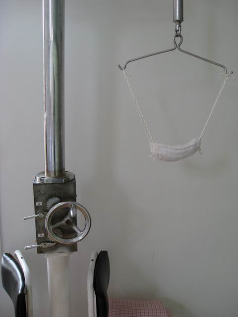 После кровопускания мне показалась очень остроумным приспособлением «Виселица»: сверху свисает интересно сделанная петля с лямочками, в эту петлю надо сунуть свою голову, после этого медсестра сзади скрипит рычагом и начинает отрывать ее от позвоночника. Когда тебе становится совсем хорошо, медсестра встает перед тобой и, легко стукнув сбоку тебе в нос, показывает, что голова теперь крутится без шеи легко в любую сторону. Правда любопытно.