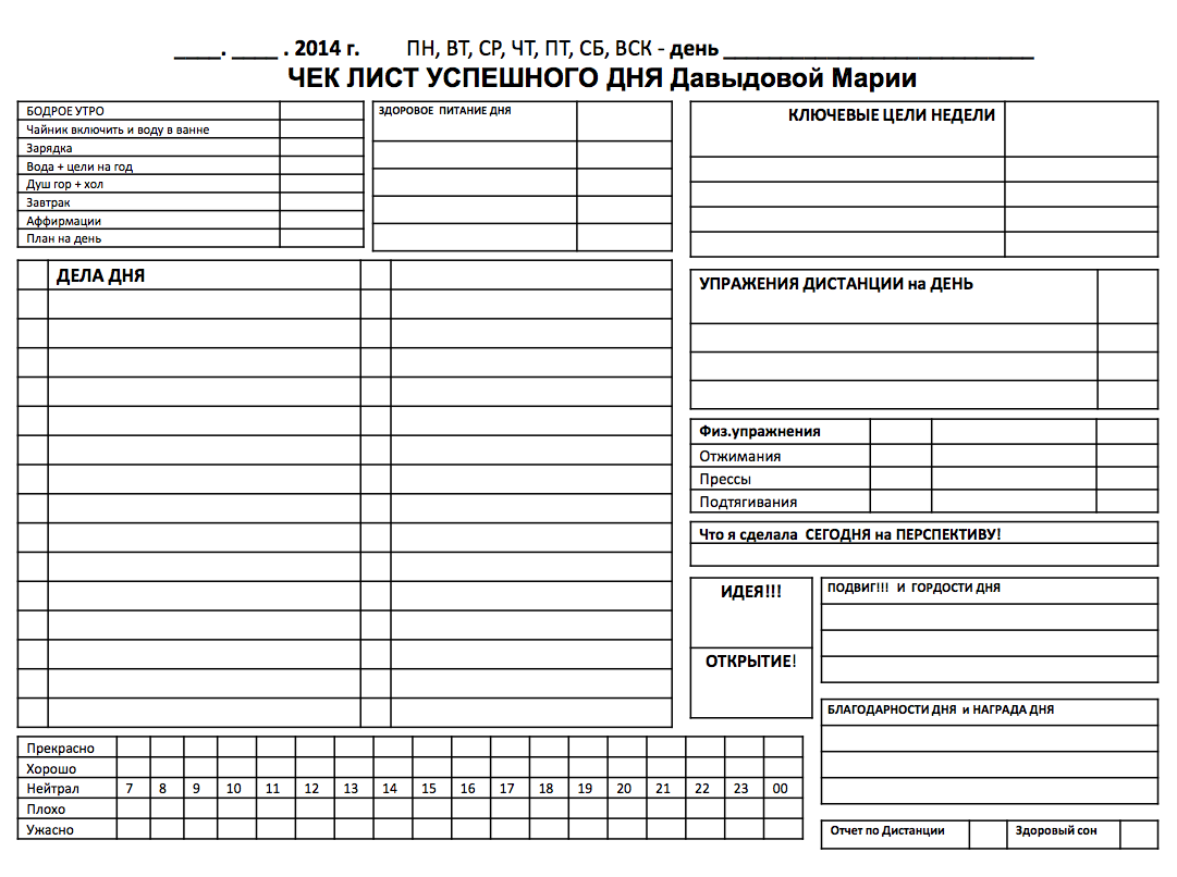 Встали — сделали ритуал «Бодрое утро». Умыться (лучше холодной водой — просыпаемся!), причесаться (сразу происходит массаж головы), выпить горячей воды (организму после сна — нужно). Далее — легко размяться и продумать дела дня. Наверное, с вечера в календаре у вас много уже запланировано на сегодня. Просмотрели, продумали, что-то добавили, расставили по приоритетам и сделали, где нужно, привязки по времени. Все писать: можно в календаре на компьютере, можно просто рукой на листе бумаге, отлично воспользоваться чек-листом. Задача: вы должны увидеть свой день, как вы делаете все дела одно за другим, и такой день вам должен уже заранее понравиться!